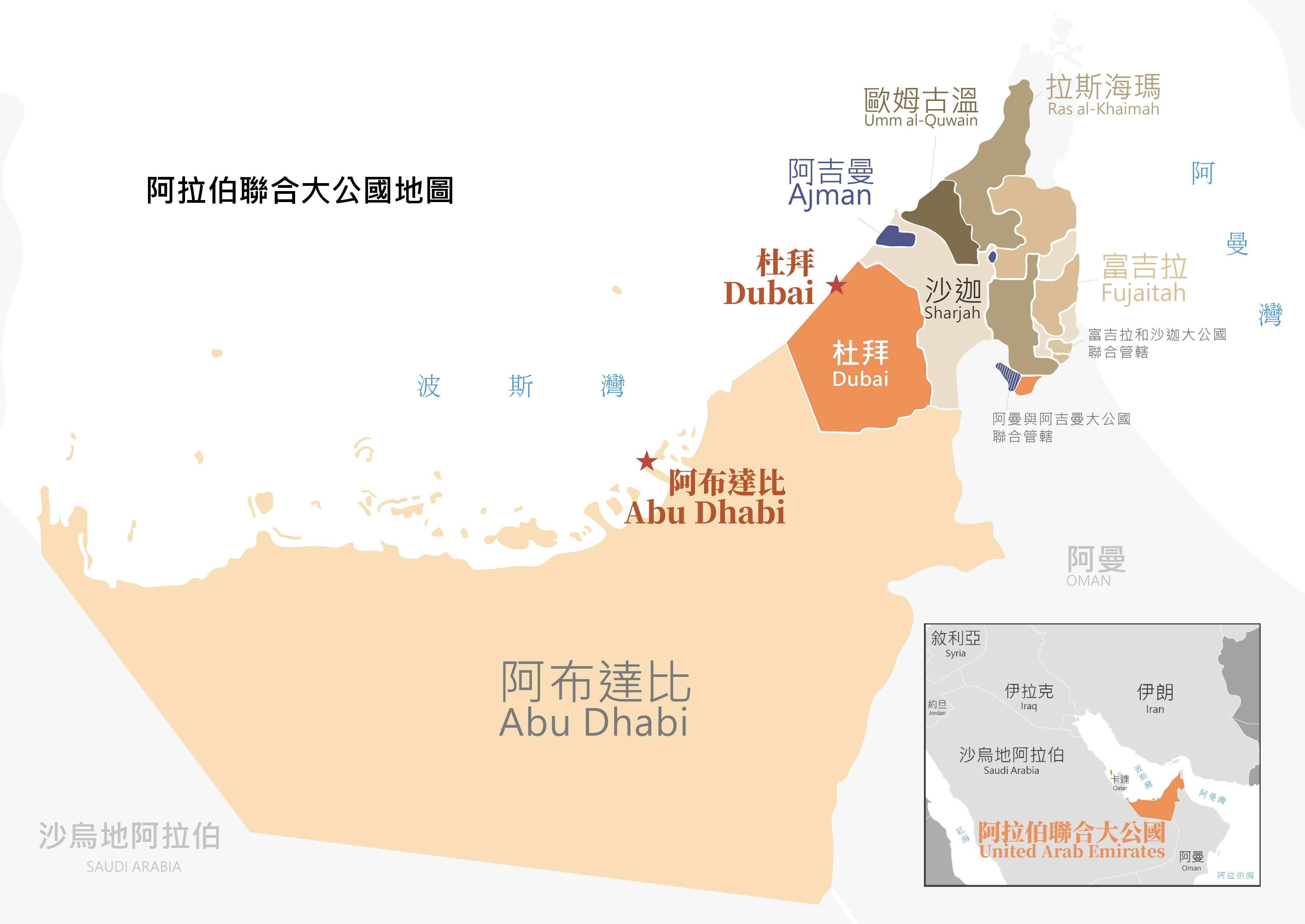 首都及主要都市:阿布達比(Abu Dhabi)是阿聯的首都,杜拜(Dubai)係阿聯第二大公國。