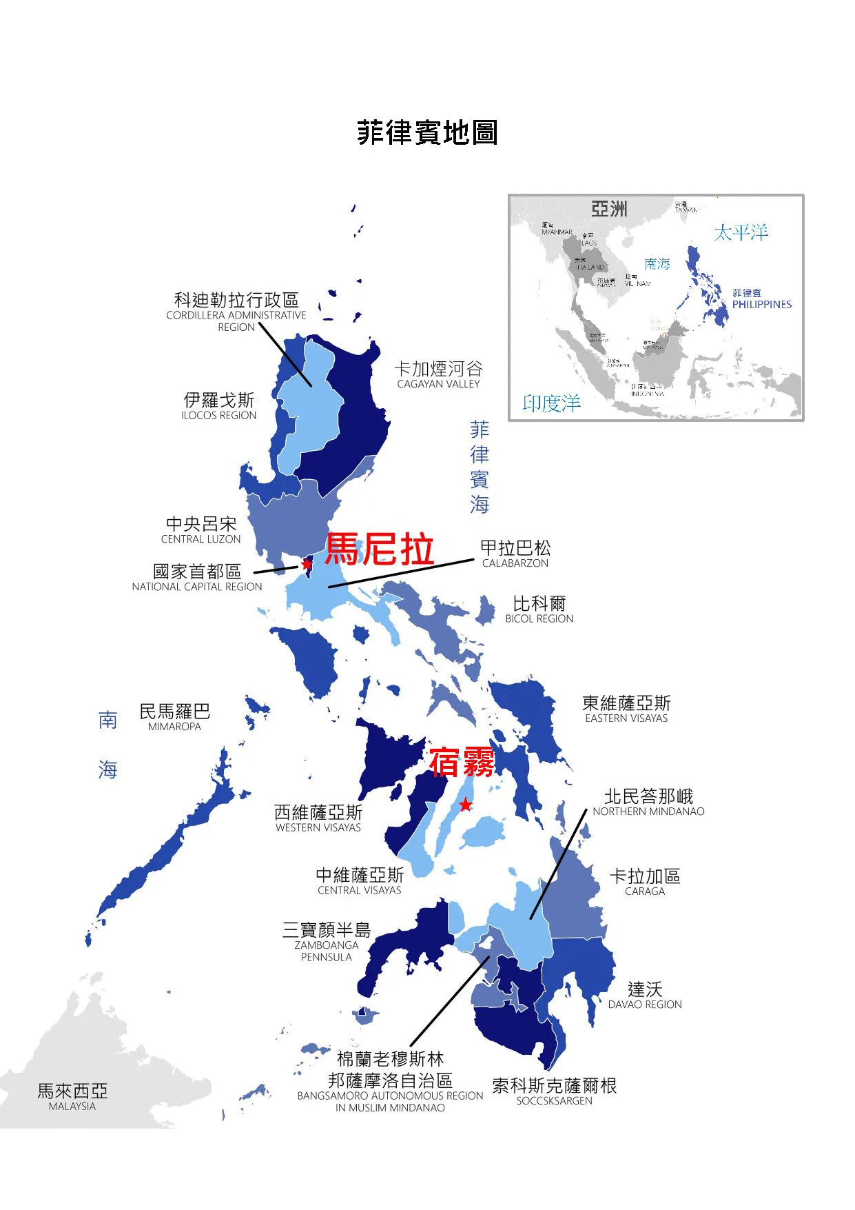 地理位置:國土282,764平方公里,比台灣大8.2倍。東濱太平洋,西臨南中國海,南接西里貝斯海與蘇祿海,北為巴士海峽,由7,107島嶼組成,分為呂宋、未獅耶及民答那峨三大群島,最北距台灣僅52.8公里。