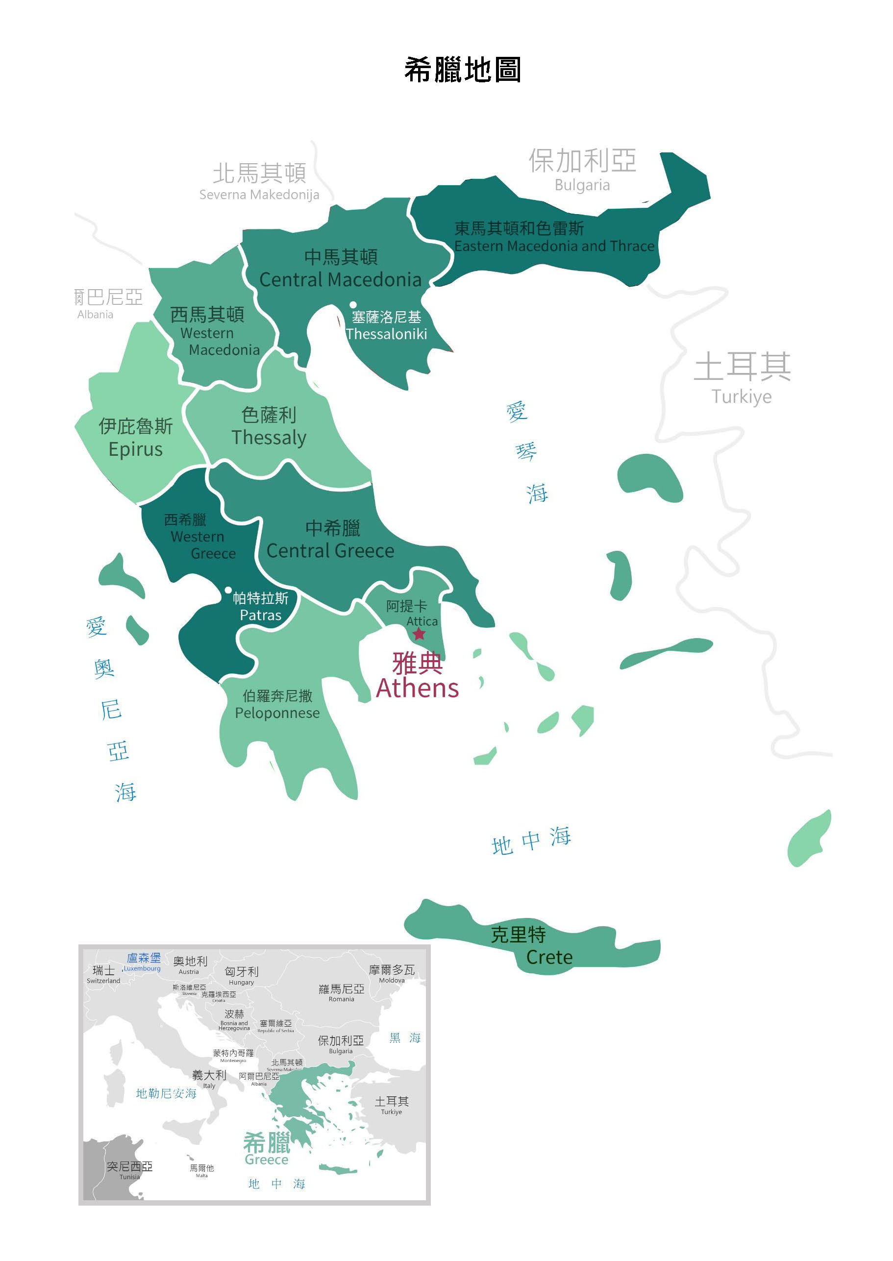 地理位置:總面積為 131,957 平方公里,約為台灣 3.6 倍。位於巴爾幹半島南端,北與阿爾巴尼亞、馬其頓、保加利亞為鄰,西與義大利,東與土耳其隔海相望。全國3,000餘座島嶼構成。