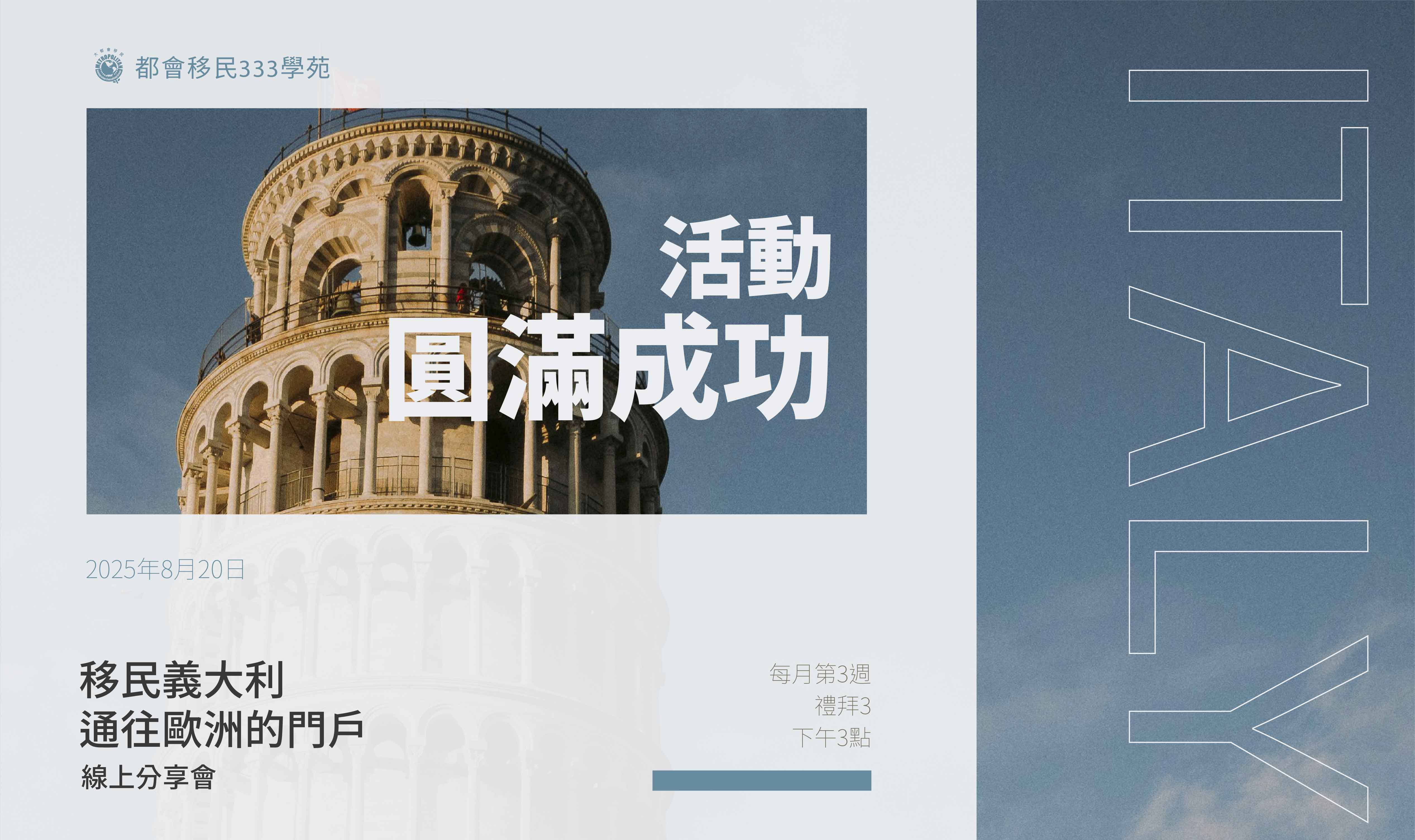 在2025年8月20日,大都會移民特別推出「移民義大利-通往歐洲的門戶線上分享會」專題活動。除了介紹義大利這個擁有深厚文化底蘊與美麗風景的國家,活動更針對如何申請居留與簽證流程、移民相關法規的解析、創新初創企業 Moonstone 的投資方案,進行了全面而詳盡的解說,幫助貴賓深入了解義大利移民的優勢與機會,並以更完善的方式走向國際舞台。